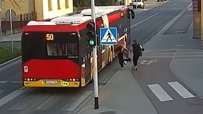 In der polnischen Kleinstadt Czechowice-Dziedzice sorgten zwei 17-Jährige Mädchen für Aufruhr. Während die beiden entspannt die Straße entlang liefen, schubste das eine Mädchen ihre Freundin plötzlich vor den fahrenden Bus.